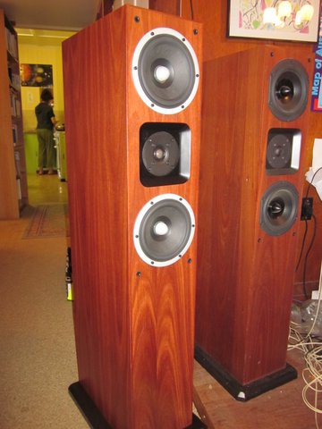 These floor standing speaker boxes are quite simply breath taking when set up properly. They were designed by Russell Story of Stone Sound Studio (who also trades as Artisan) specifically for WES Components (Wagner Electronics). The rear ported cabinets come pre-assembled and are professionally constructed, the drivers are made by Peerless of Denmark, the tweeter is recessed in the cabinet and is time aligned with the mid/bass drivers, the custom crossovers use non inductive resistors and high quality Solen brand capacitors and inductors. Each loaded cabinet weighs around 30Kg, the base of each speaker box contains a cavity that can hold an additional 20 Kg of sand ballast for those who require it (not really needed). Black vinyl or Jarrah timber finish.
